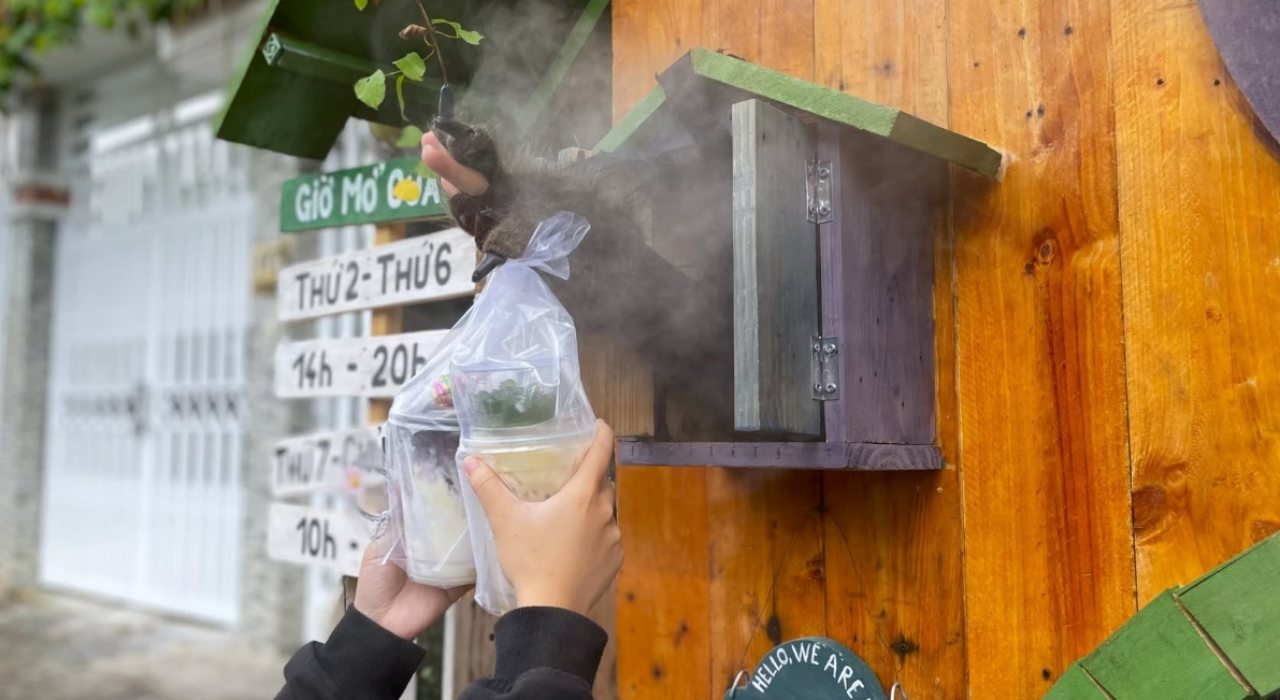 Khách đến quán sẽ chọn món qua thẻ menu treo trước cửa, nếu muốn thêm topping hoặc tăng kích cỡ, chỉ cần lấy thêm thẻ tương ứng. Sau đó, người mua điền tên món vào giấy, cho vào hộp bí mật cùng tiền mặt hoặc quét mã QR để thanh toán.