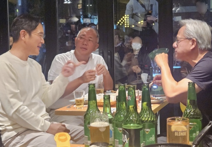 Ba “ông lớn” Jensen Huang, Lee Jae-yong và Chung Euisun gây sốt khi cùng nhậu “chimaek” ở Seoul, tặng quà khủng và đùa vui chuyện ai trả tiền bữa ăn.