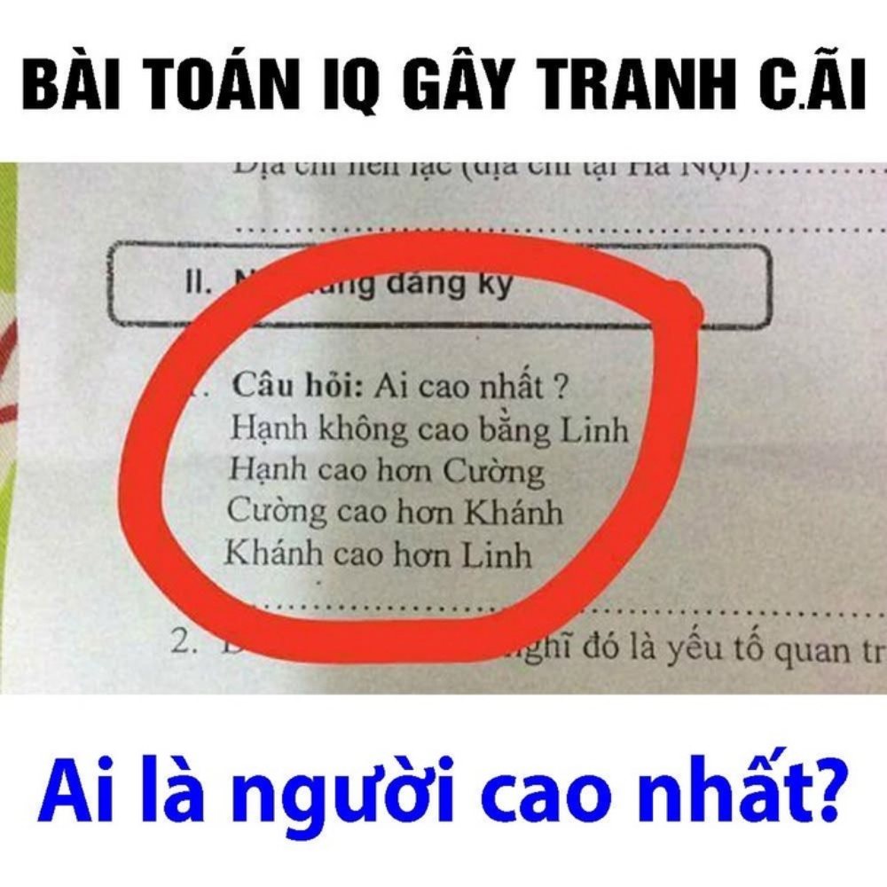 Câu đố được chia sẻ trên mạng xã hội có nội dung như sau: Hạnh không cao bằng Linh, Hạnh cao hơn Cường, Cường cao hơn Khánh, Khánh cao hơn Linh. Hỏi ai cao nhất? Chắc chắn nhiều người khi đọc câu đố này sẽ phải ôm đầu suy nghĩ bởi độ khó của nó.