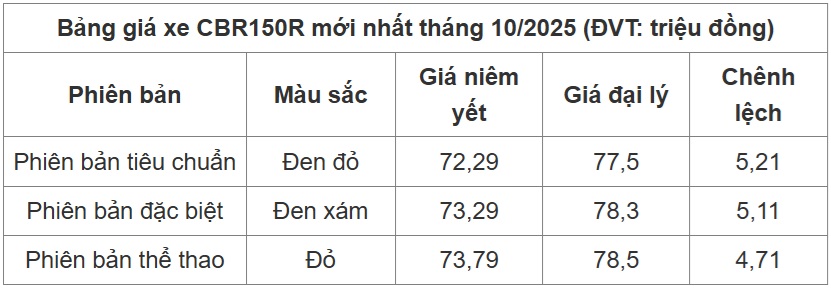 So với tháng 9, giá niêm yết của xe Honda CBR150R trong tháng 10/2025 vẫn ổn định, cụ thể như sau: Bản tiêu chuẩn đang được bán với giá 72,29 triệu đồng, bản đặc biệt đang được bán với giá 73,29 triệu đồng và bản thể thao đang được bán với giá 73,79 triệu đồng.