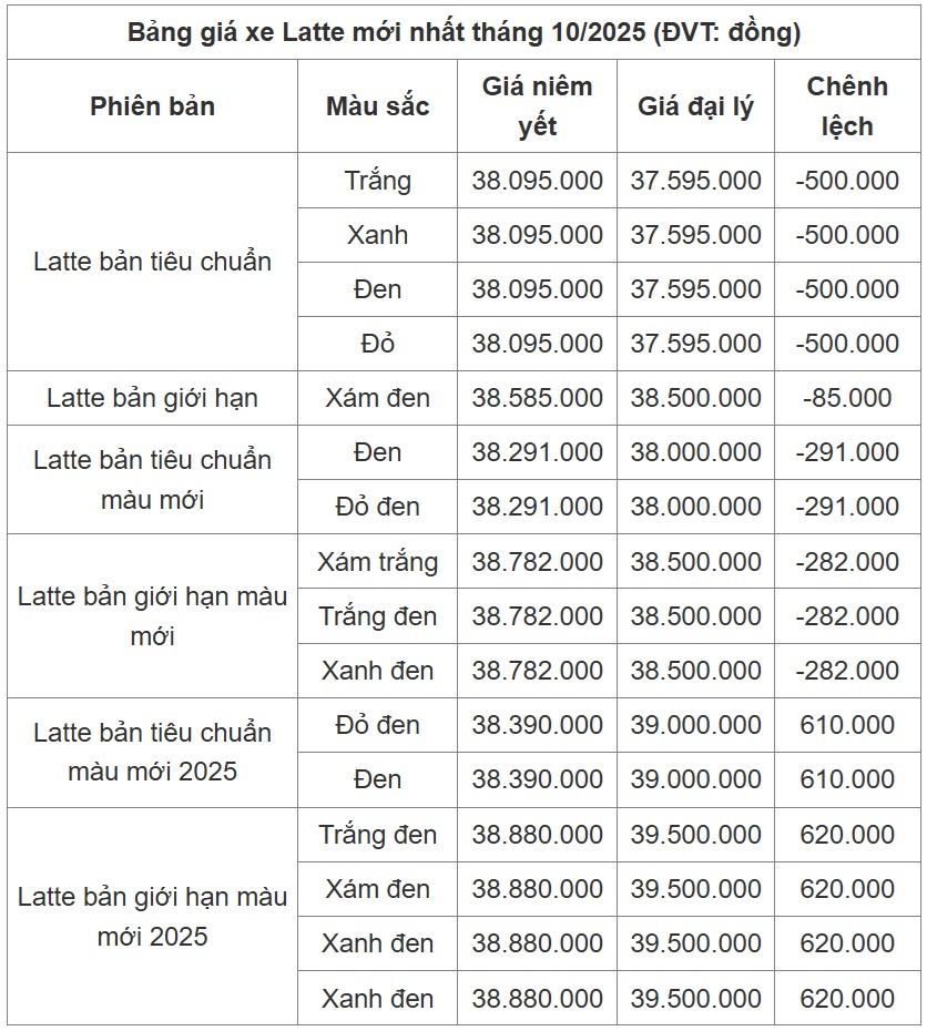Cập nhật bảng giá xe Latte mới nhất tháng 10/2025 tại các đại lý trên cả nước.