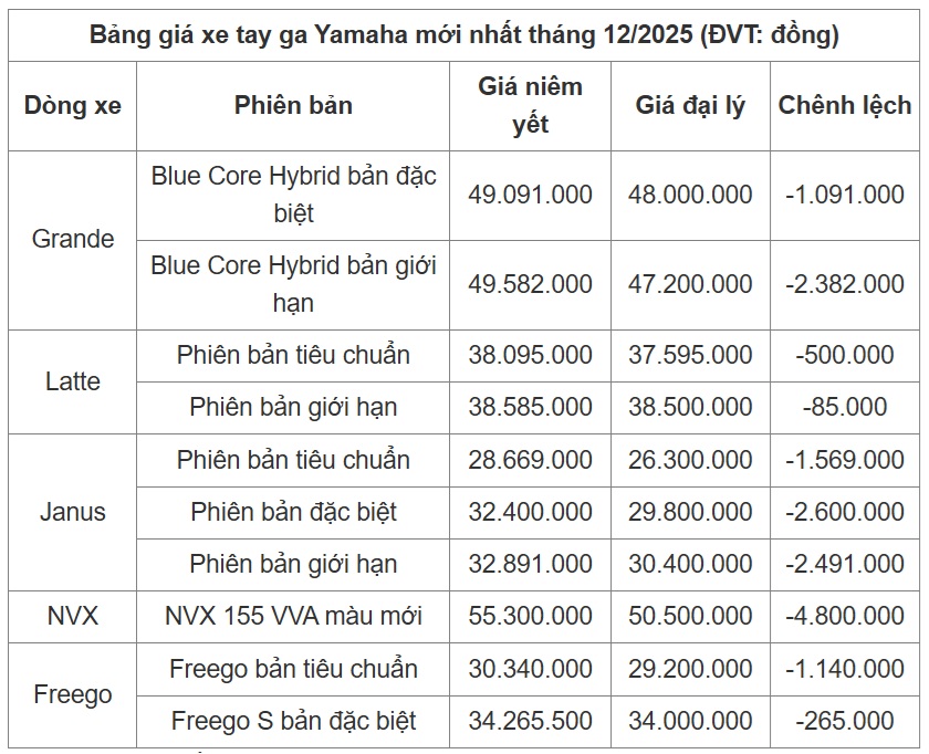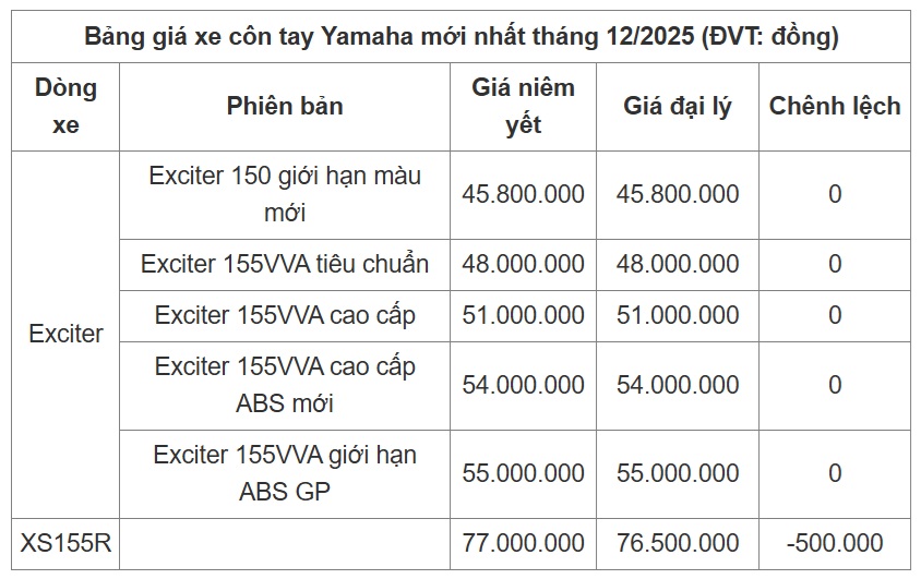 Mức giá niêm yết của các dòng xe côn tay hãng Yamaha trong tháng 12/2025 không có sự thay đổi nào so với tháng trước, tiếp tục bán trong khoảng từ 45.800.000 - 77.000.000 đồng/xe.