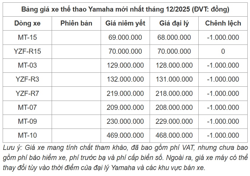 Hiện giá xe thể thao hãng Yamaha tại các đại lý trong tháng 12/2025 không có sự biến động mới. Giá bán thực tế đang thấp hơn giá đề xuất của hãng 1.000.000 đồng, mức giá bán cao nhất được ghi nhận đối với xe MT-10.