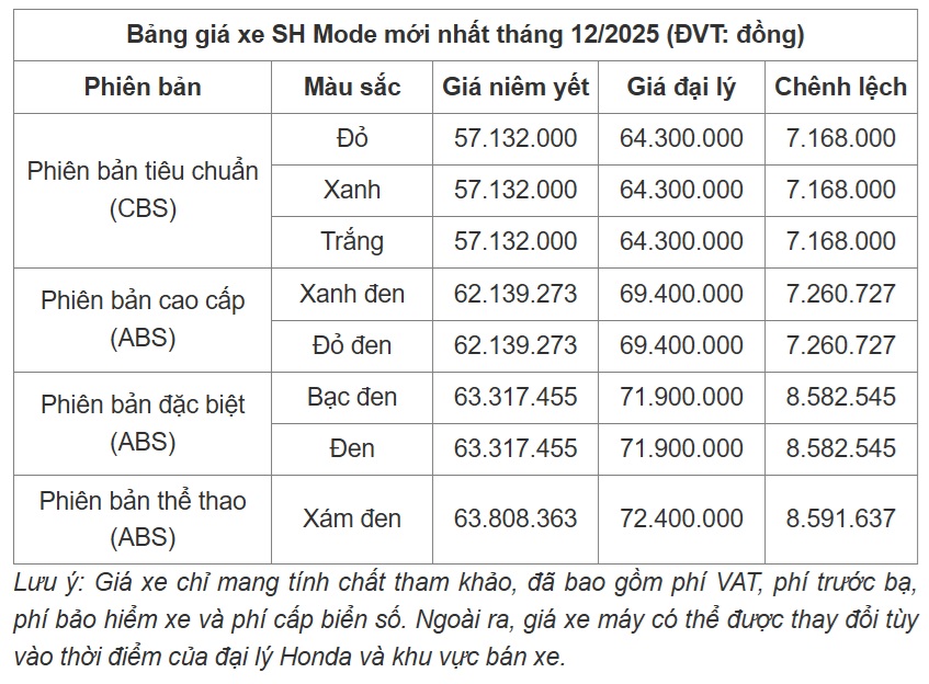 So với tháng trước, giá niêm yết của xe Honda SH Mode trong tháng 12/2025 vẫn ổn định, cụ thể: Phiên bản tiêu chuẩn đang có mức giá bán 57.132.000 đồng, phiên bản cao cấp đang có mức giá bán 62.139.273 đồng, phiên bản đặc biệt đang có mức giá bán 63.317.455 đồng và phiên bản thể thao đang có mức giá bán 63.808.363 đồng.