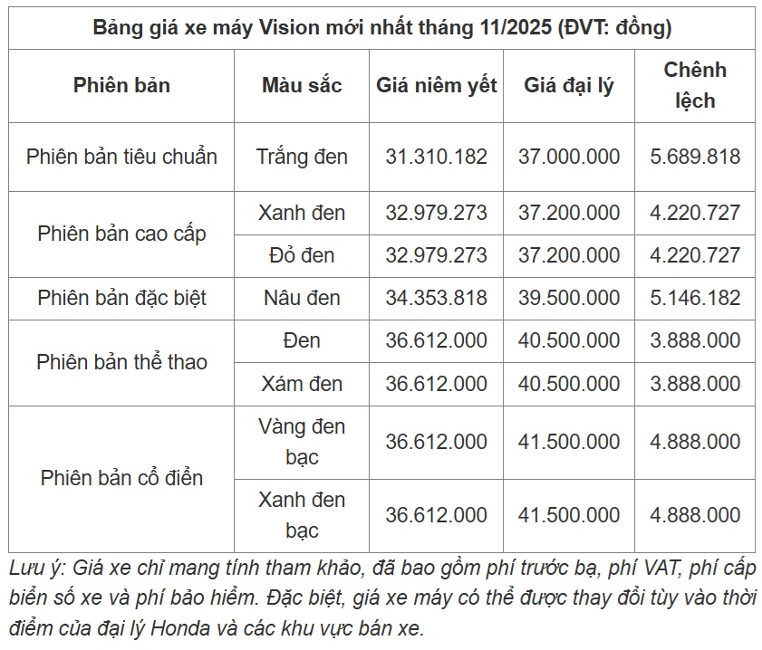 So với tháng trước, mức giá niêm yết của xe máy Honda Vision trong tháng 11/2025 vẫn ổn định, cụ thể: Phiên bản tiêu chuẩn đang có mức giá 31.310.182 đồng, phiên bản cao cấp đang có mức giá 32.979.273 đồng, phiên bản đặc biệt đang có mức giá 34.353.818 đồng, phiên bản thể thao đang có mức giá 36.612.000 đồng và phiên bản cổ điển đang có mức giá 36.612.000 đồng.
