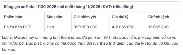 Xe mô tô Rebel 1100 2025 trong tháng 11 này vẫn bán ra thị trường với một phiên bản DCT và một tùy chọn màu sắc đen. Hiện giá niêm yết đang ở mức bán 399.990.000 đồng.