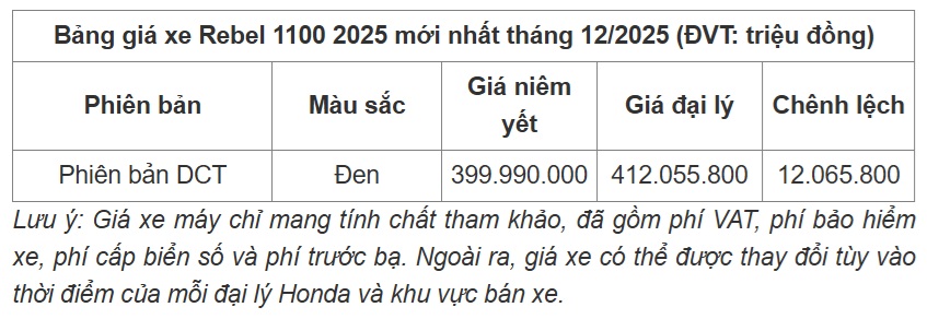 So với tháng trước, xe mô tô Rebel 1100 2025 trong tháng 12/2025 tiếp tục bán ra thị trường với một phiên bản DCT đi kèm tùy chọn màu sắc đen. Giá niêm yết hiện đang có bán ở mức 399.990.000 đồng.
