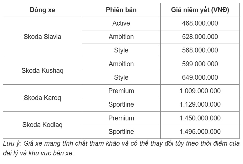 Trong tháng 1/2026, giá xe Skoda tại Việt Nam nhìn chung duy trì ở mức cạnh tranh so với các đối thủ cùng phân khúc. Các đạo lý tiếp tục áp dụng những chương trình ưu đãi nhằm kích cầu đầu năm như hỗ trợ 100% lệ phí trước bạ với các mẫu xe Skoda Kushaq và Slavia.