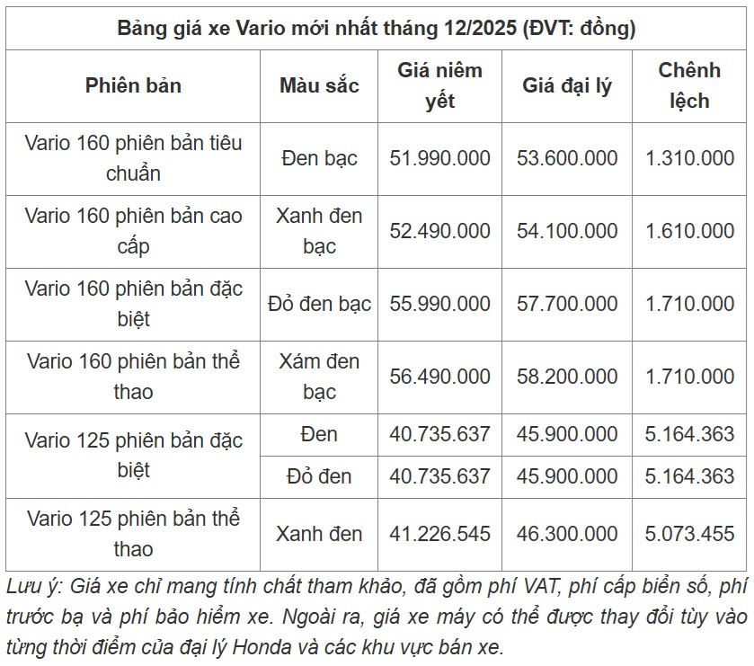 Bảng giá xe máy Vario mới nhất tháng 12/2025 tại các đại lý trên cả nước, bảng giá chi tiết sẽ được cập nhật trong bài viết dưới đây.