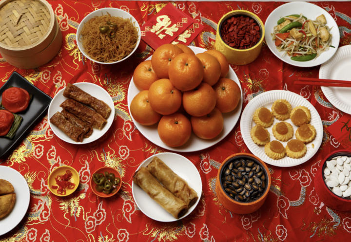 Người Trung Quốc cũng kiêng ăn thịt con giáp của năm vào đầu năm. Mâm cỗ Tết vì thế thiên về các loại bánh, nổi bật là bánh tổ (Nian Gao) làm từ nếp ngon, đường và chút gừng tươi.