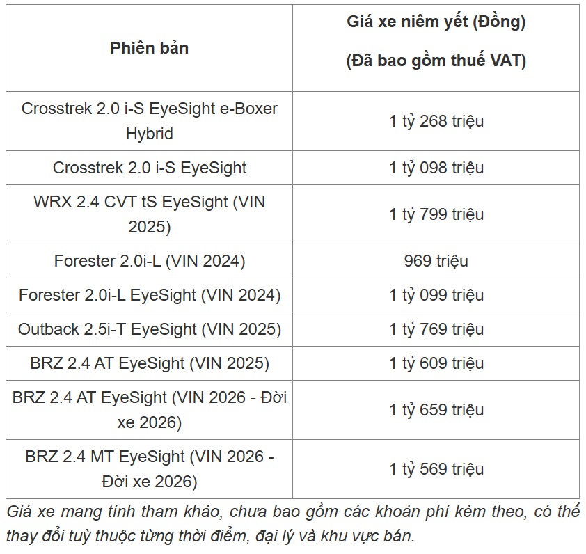 Cập nhật Bảng giá xe ô tô Subaru mới nhất tại Việt Nam tháng 10/2025 được cập nhật chi tiết trong bài viết dưới đây.