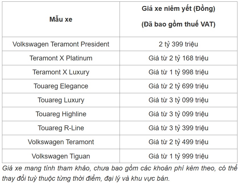 Cập nhật bảng giá xe ô tô Volkswagen mới nhất tại Việt Nam tháng 10/2025 chi tiết trong bài viết dưới đây.
