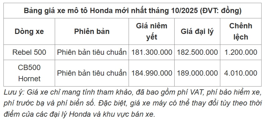 So với tháng 9/2025, giá niêm yết của các dòng xe mô tô hãng Honda trong tháng 10 này không có sự điều chỉnh nào, cụ thể: Mẫu xe Rebel 500 vẫn có giá bán 181.300.000 đồng và mẫu xe CB500 Hornet vẫn có giá bán 184.990.000 đồng.