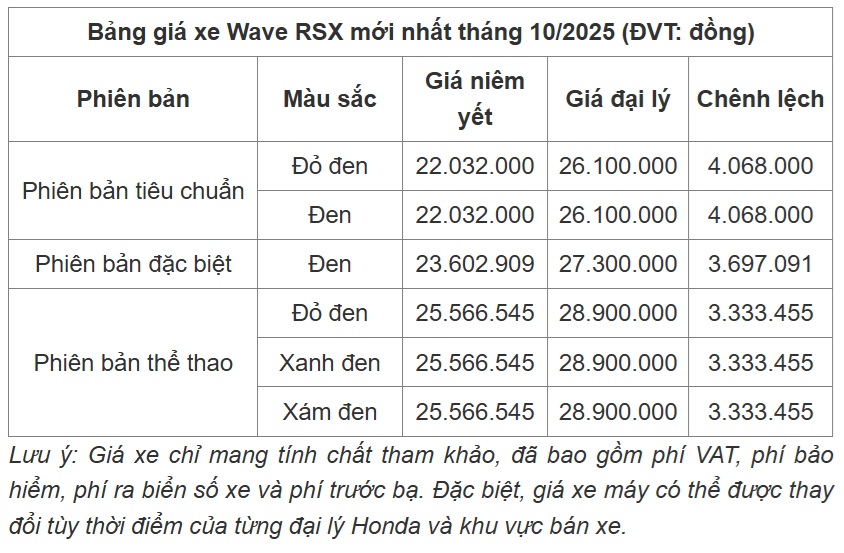 So với tháng 9, giá niêm yết của xe Honda Wave RSX trong tháng 10/2025 không có sự điều chỉnh mới nào, cụ thể: Phiên bản tiêu chuẩn đang có giá 22.032.000 đồng, phiên bản đặc biệt đang có giá 23.602.909 đồng và phiên bản thể thao đang có giá 25.566.545 đồng.