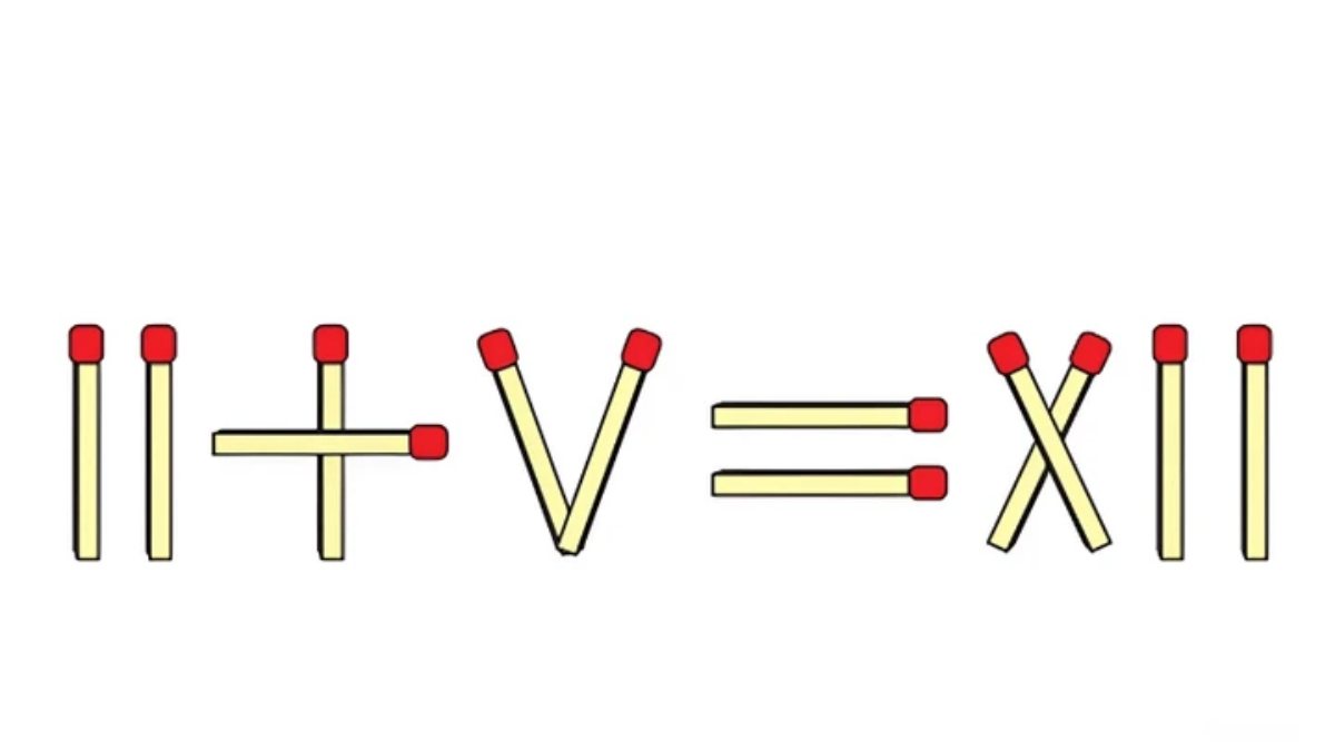 Hình ảnh cho thấy một phép tính được tạo từ các que diêm: II + V = XII. Nhiệm vụ đặt ra là di chuyển số lượng que diêm theo yêu cầu để biến phép tính này trở nên đúng. Không được bẻ gãy, không thêm bớt que, người chơi buộc phải tư duy linh hoạt, kết hợp giữa toán học và cách đọc ký hiệu La Mã.