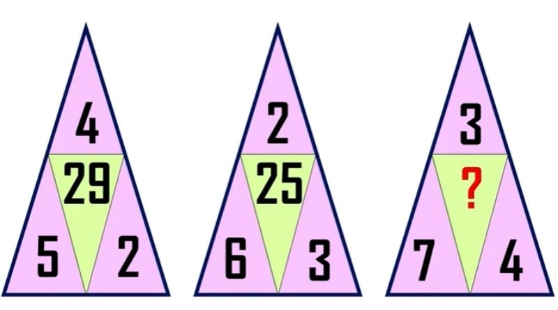 Quan sát ba hình tam giác trong bức hình, mỗi tam giác gồm ba số ở các cạnh và một số nằm ở trung tâm. Hai hình đầu tiên cho thấy mối liên hệ logic giữa các con số xung quanh và số ở giữa.