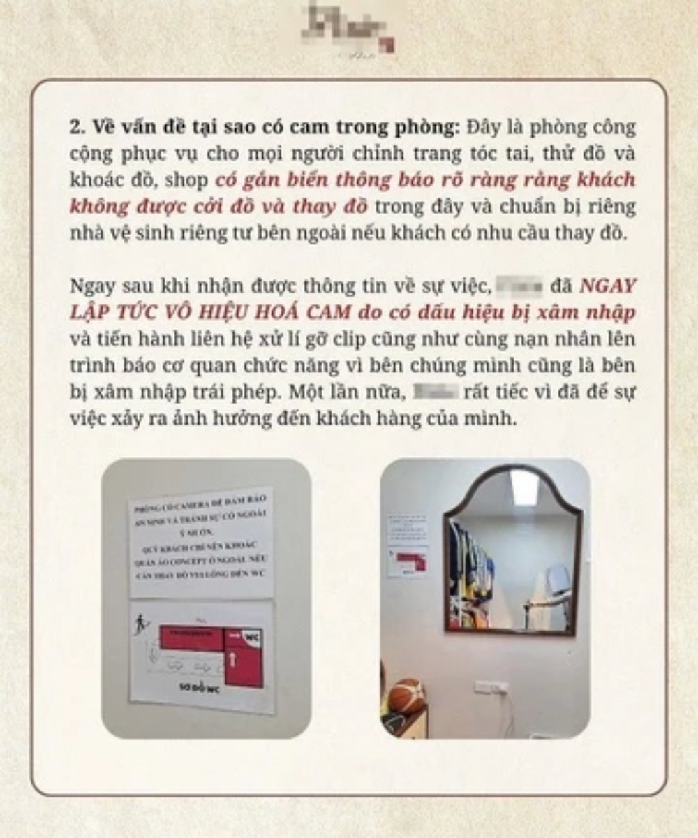 Bên cạnh đó, nhằm tránh sự việc tương tự tái diễn, tiệm tiến hành vô hiệu hóa và gỡ bỏ camera bị xâm nhập; vén toàn bộ rèm phòng để khách không hiểu nhầm là phòng thay đồ đồng thời bổ sung và phóng to biển báo cho khách dễ thấy.