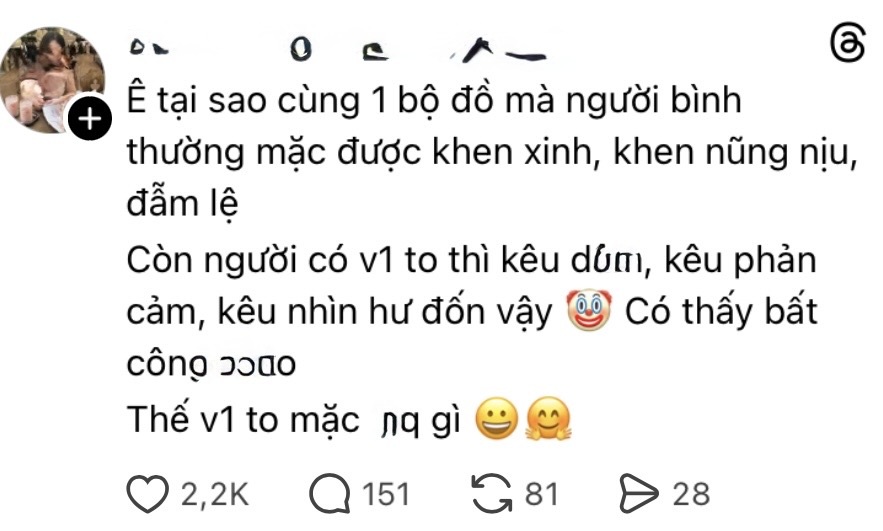 Đây là câu hỏi mà chúng ta cần thẳng thắn đối diện. Khi một người phụ nữ mặc kín đáo mà vẫn bị quấy rối bằng lời nói, lỗi chắc chắn không nằm ở trang phục và càng không nằm ở cơ thể của họ. Xu hướng đổ lỗi cho nạn nhân vẫn hiện hữu. Nếu mặc hở, người ta nói là "mời gọi". Nếu mặc kín mà vẫn bị soi, người ta lại bảo "tại vóc dáng khêu gợi quá". Cô gái trong ảnh rõ ràng đang mặc những trang phục rất phổ thông, nhưng chính sự "quá khổ" của vòng 1 đã biến cô thành mục tiêu của những ý nghĩ đen tối.