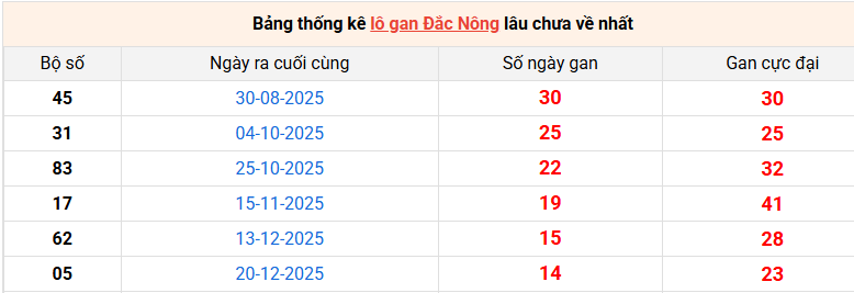 Bảng thống kê lô gan Đắc Nông lâu về nhất