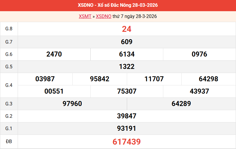 Bảng kết quả Đắk Nông ngày 28/03/2026 tuần trước
