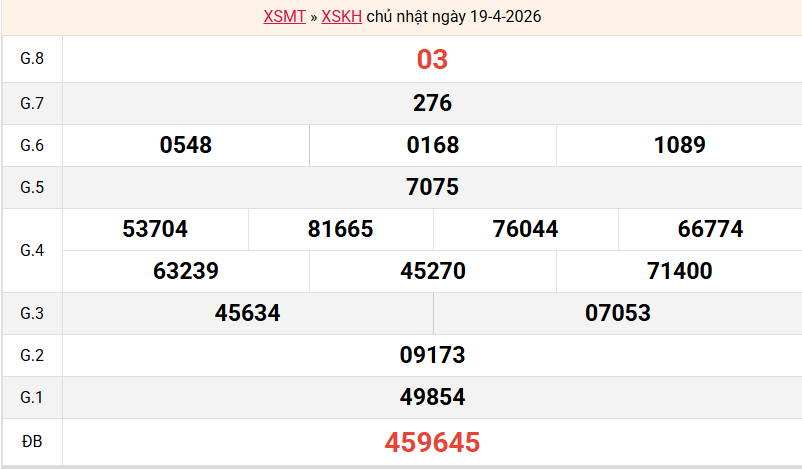 Mời các bạn xem lại bảng kết quả kỳ trước với giải đặc biệt, giải tám, lô tô 2 số để có thể đưa ra nhận định dự đoán KH ngày 22/04/2026 chuẩn xác nhất.