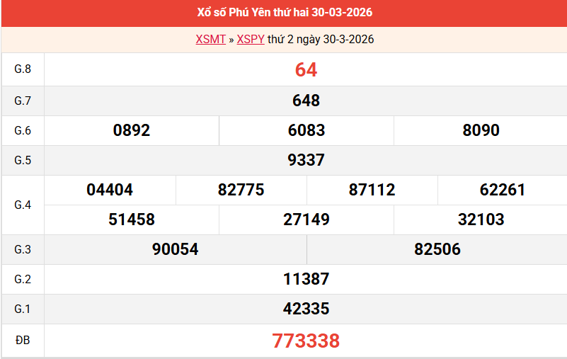 Bảng kết quả Phú Yên ngày 30/03/2026 hôm trước