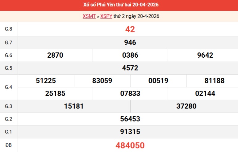 Bảng kết quả Phú Yên ngày 20/04/2026 hôm trước