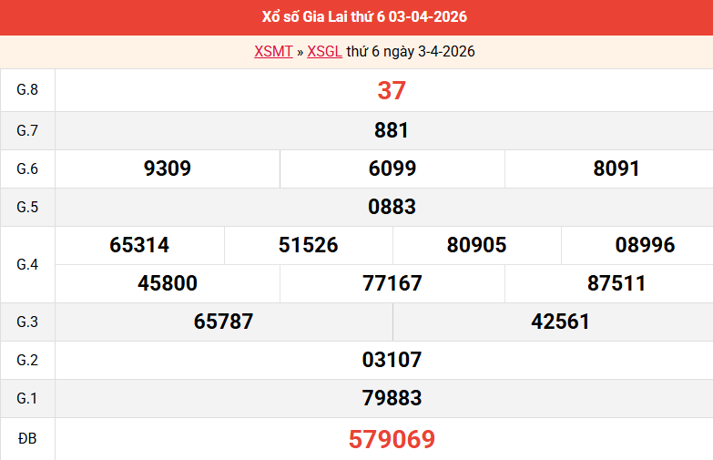 Mời các bạn xem lại bảng kết quả kỳ trước với giải đặc biệt, giải tám, lô tô 2 số để có thể đưa ra nhận định dự đoán GL ngày 10/04/2026 chuẩn xác nhất.