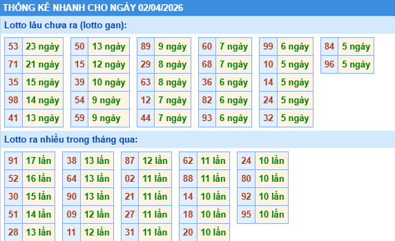 Thống kê loto miền Bắc ngày 02/04/2026 chính xác 100% bao gồm: XSMB 100, 90, 60, 30 ngày qua, Tần suất LOTO,,... giúp bạn dễ dàng loại bỏ những bộ số không nên đánh trong ngày.