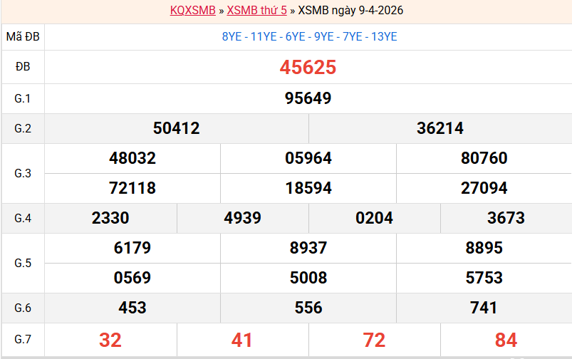 ✅ 2. Tổng hợp kết quả miền Bắc hôm qua ngày 09/04/2026