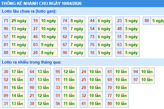 Bảng tần suất lô tô miền bắc ngày 10/04/2026