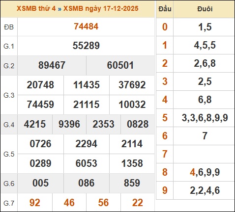 Bảng kết quả xổ số miền Bắc 17/12/2025 hôm qua