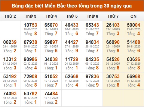 Thống kê GĐB XSMB theo tổng trong 30 ngày gần đây tính đến 18/12/2025