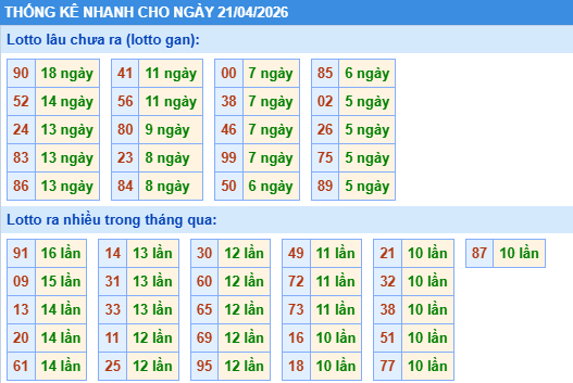 Thống kê loto miền Bắc ngày 21/04/2026 chính xác 100% bao gồm: XSMB 100, 90, 60, 30 ngày qua, Tần suất LOTO,,... giúp bạn dễ dàng loại bỏ những bộ số không nên đánh trong ngày.