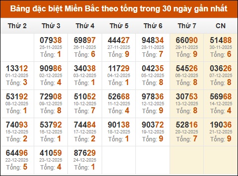 Thống kê GĐB XSMB theo tổng trong 30 ngày gần đây tính đến 25/12/2025