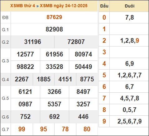 Từ bảng kết quả xổ số miền Bắc ngày 24/12/2025, chuyên trang xin đưa ra những số liệu thống kê phân tích kết quả quan trọng và chi tiết sau đây: