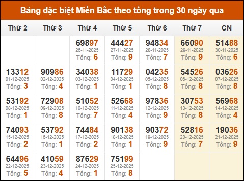 Thống kê giải đặc biệt theo tổng trong vòng 30 ngày tính đến 26/12/2025