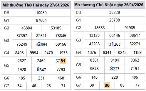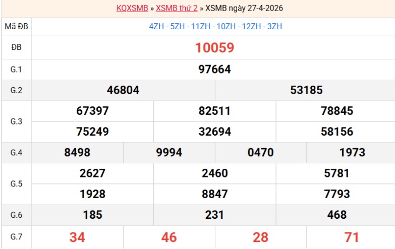 Bảng kết quả hôm qua ngày 27/04/2026
