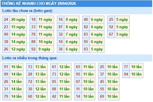 Thống kê loto miền Bắc ngày 28/04/2026 chính xác 100% bao gồm: XSMB 100, 90, 60, 30 ngày qua, Tần suất LOTO,,... giúp bạn dễ dàng loại bỏ những bộ số không nên đánh trong ngày.