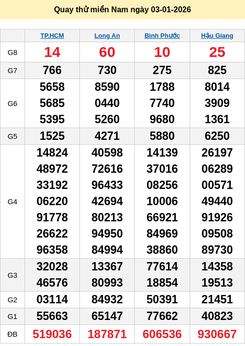 Bảng quay thử miền Nam 03/01/2026