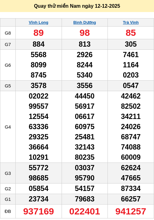 Bảng quay thử miền Nam 12/12/2025