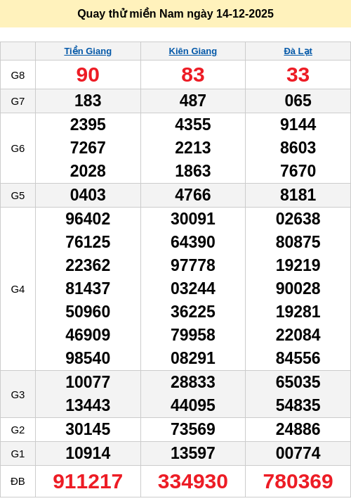 Lưu ý: Tất cả những dự đoán miền Nam ngày 14 tháng 12 năm 2025 trên đây đều chỉ mang tính chất tham khảo. Ldg.com.vn không cho số hay chốt số dưới mọi hình thức. Tất cả các hình thức cho số đều là lừa đảo. Chúc các bạn may mắn!