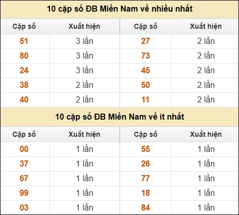 ⚡ 10 cặp số ĐB Miền Nam về nhiều nhất/ ít nhất tính đến ngày 21/12/2025: