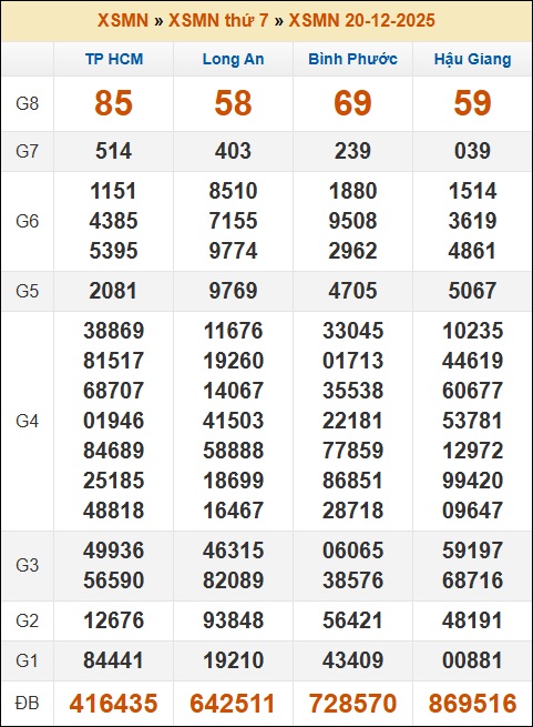 Kết quả xổ số Miền Nam 20/12/2025 thứ 7 tuần trước
