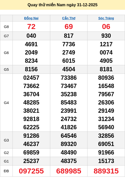 2. Thống kê lô tô miền Nam ngày 31/12/2025 thứ 4