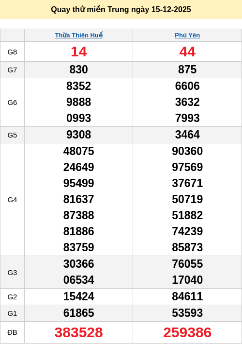 Bảng quay thử miền Trung 15/12/2025