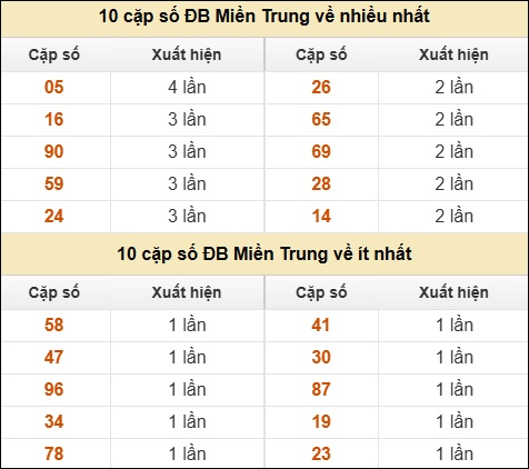 ⚡ 10 cặp số ĐB XSMT về nhiều nhất/ ít nhất tính đến ngày 25/12/2025: