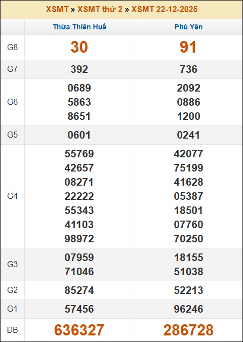 Kết quả xổ số Miền Trung 22/12/2025 thứ 2 tuần trước