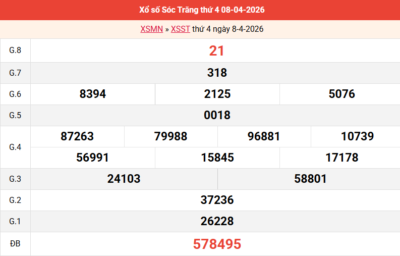 Bảng kết quả Sóc Trăng ngày 08/04/2026 tuần trước