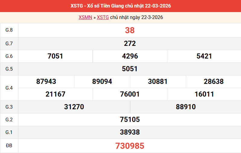 Bảng kết quả Tiền Giang ngày 22/03/2026 tuần trước